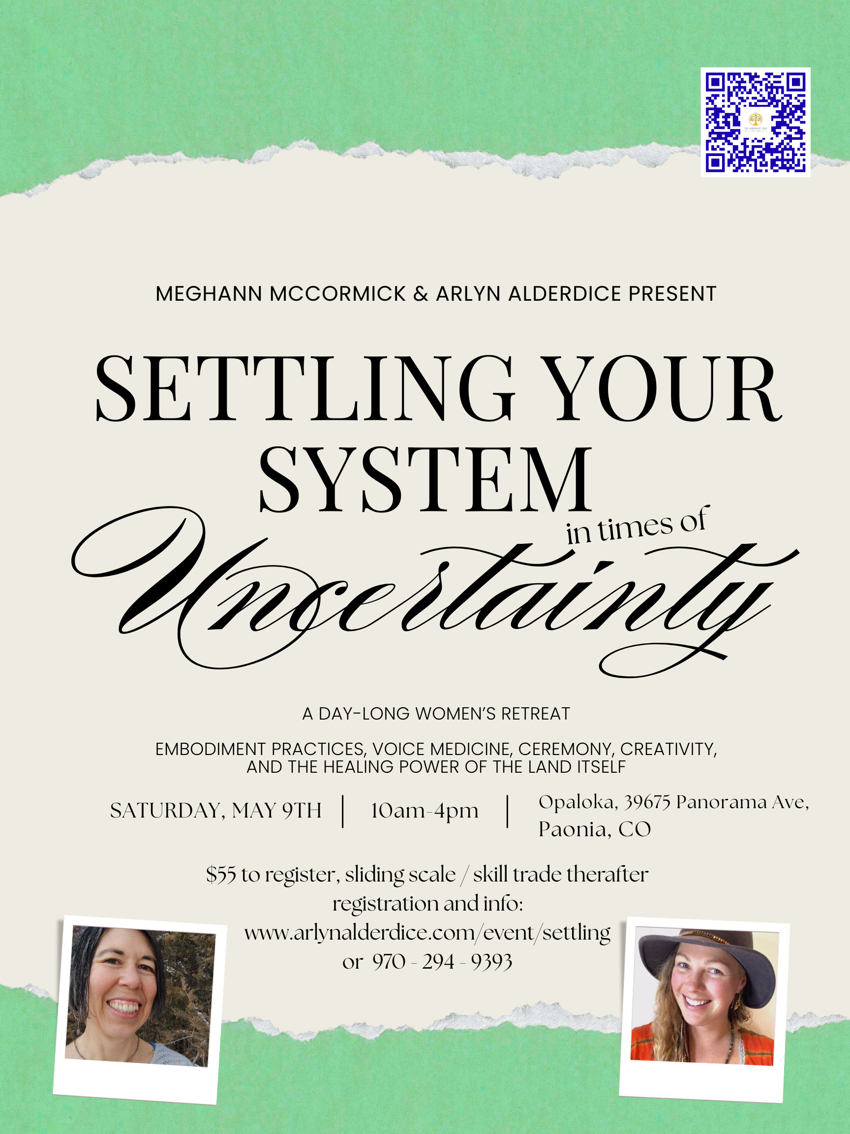 Through embodiment practices, voice medicine, ceremony, creativity, and the healing power of the land itself — we will spend six hours remembering what it feels like to be at home in our own bodies, our own voices, and our own lives.
